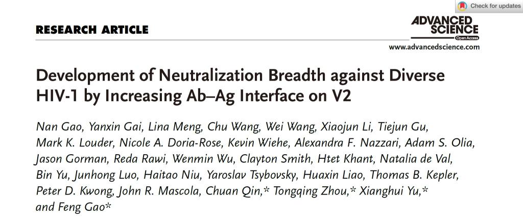 高峰教授、于湘晖教授科研团队针对目前已知报道感染时间最长的恒河猴动物模型作为研究对象,分析其体内诱导产生的广谱中和活性。通过抗体分离获得针对特异表位的J038广谱中和抗体谱系。该工作研究抗体谱系以及体内病毒包膜蛋白的突变情况,追溯广谱中和抗体的进化过程以及与SHIV共同进化的过程,分析非人类灵长动物体内与人体内产生广谱中和抗体的类似性,为更好地应用恒河猴模型来评价HIV-1疫苗提供理论和实验依据。该J038谱系抗体的发育细节和识别特征为今后V2靶向广谱中和抗体的研究和应用提供了新的见解。该研究成果于2022年03月24日在学术期刊《Advanced Science》在线发表(Development of Neutralization Breadth against Diverse HIV-1 by Increasing Ab–Ag Interface on V2)。论文第一完成单位为司机社