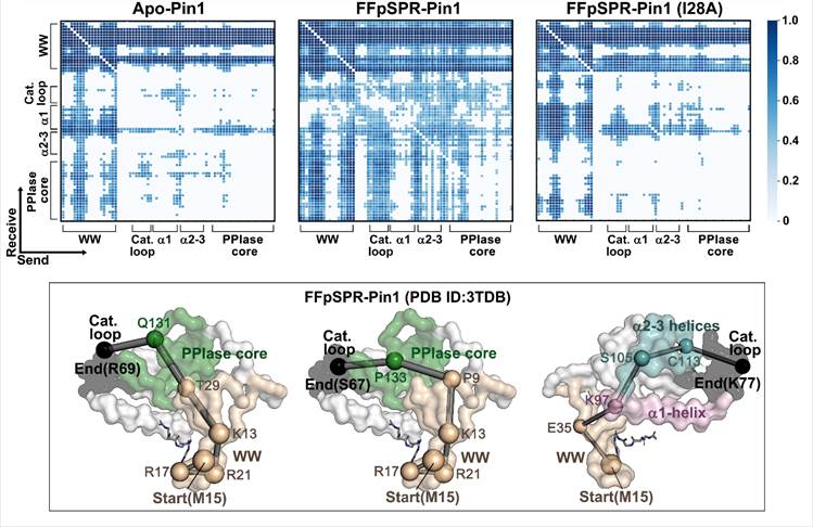 分子动力学(MD)模拟已经成为一种成熟的技术手段来探究生物学过程中涉及的各种动态调控过程,深刻地促进了生命科学和药物研发等领域的长足发展,2013年马丁·卡普拉斯等三位科学家因此荣获诺贝尔奖。然而,由于模拟时间尺度的局限性以及模拟轨迹数据的高维度性和复杂性,难以从轨迹中获得与远程调控或构象变化直接相关的氨基酸非线性关系。许东教授、韩葳葳教授团队通过深入合作,将最前沿的深度学习的方法NRI运用于生物大分子动力学模拟轨迹的分析中,根据已有的模拟轨迹数据,NRI-MD可以显示出隐藏的离散图结构,以图结构作为引导输出重构轨迹,全程以无监督的方式最小化重构轨迹和输入轨迹之间的重构误差,抽象了在构象转变中潜在的关系结构,有潜力展示出与功能直接相关的交互关系模式(图1)。该研究应用NRI-MD对Pin1、SOD1和MEK1三种酶的别构调控过程进行了深入研究,成功地捕获了驱动酶分子复杂运动的氨基酸相互作用模式以及远端残基扰动介导活性位点残基构象重排的别构调控路径(图2)。