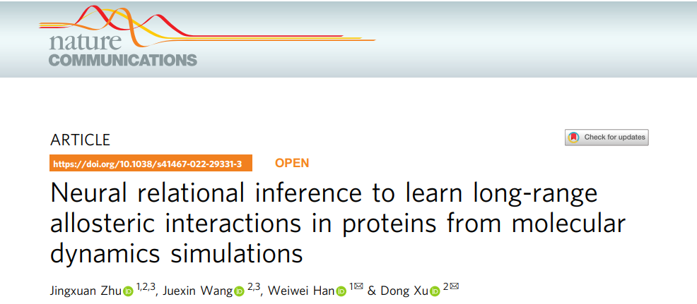 韩葳葳教授、美国密苏里大学电气工程和计算机科学系许东教授科研团队提出一种高效、可操作性强的分子动力学模拟分析方法(NRI-MD),该方法首次将深度学习的图神经网络(GNN)运用于分子动力学模拟分析,基于模拟轨迹的原子速度和位置数据,通过神经关系推理模型(NRI)直接推断出酶分子动力学模拟中残基的相互作用模式,推断出酶的别构调控路径以及氨基酸突变后相对自由能的变化。NRI-MD模型的提出为蛋白质(酶)结构-功能研究领域提供了一种新构架,有望开辟酶分子设计的新模式。研究成果于2022年03月29日在学术期刊《Nature Communications》正式发表(Neural relational inference to learn long-range allosteric interactions in proteins from molecular dynamics simulations)。论文第一完成单位为司机社