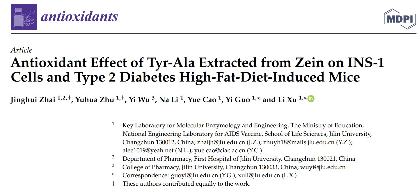 徐力教授团队在《Antioxidants》发表小分子生物活性肽调节胰岛素分泌研究成果(Antioxidant Effect of Tyr-Ala Extracted from Zein on INS-1 Cells and Type 2 Diabetes High-Fat-Diet-Induced Mice, Antioxidants 2022, 11(6), 1111)。