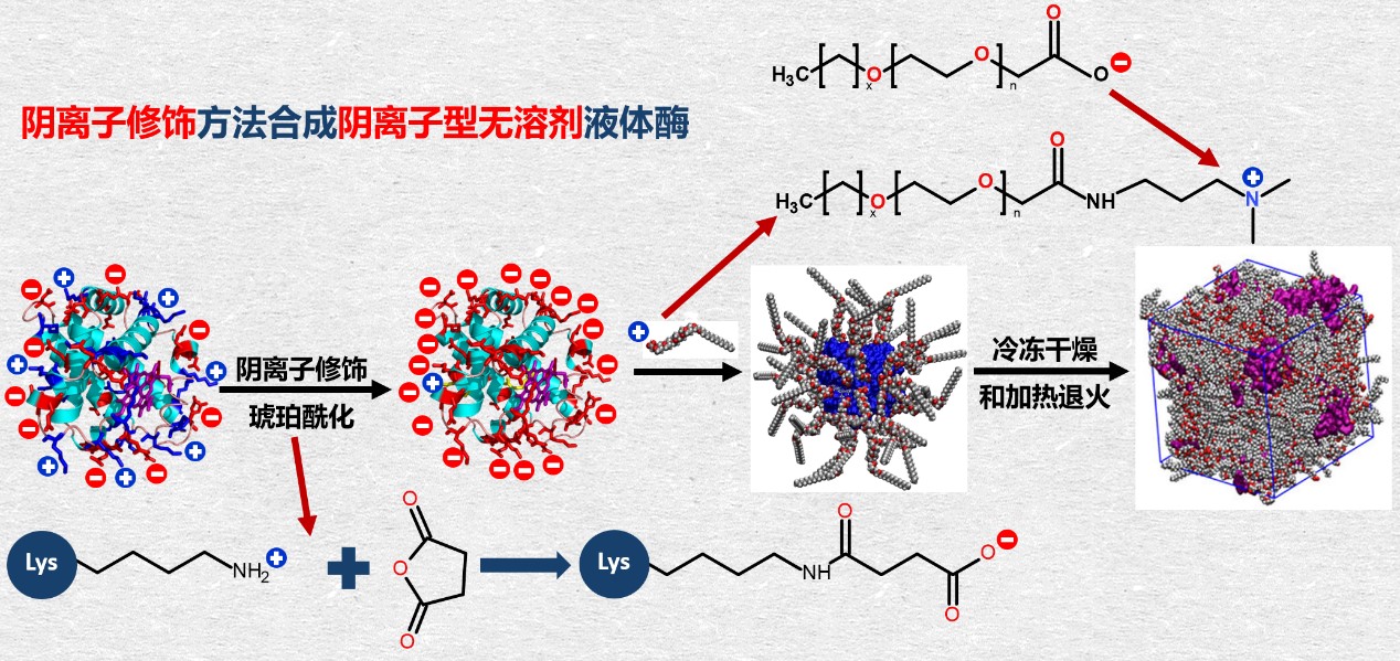本研究中,作者选取枯草杆菌脂肪酶LipA 8M突变体为研究对象,使用琥珀酸酐对蛋白质分子表面氨基(Lys残基侧链和N端α-氨基)进行完全修饰,使蛋白表面阴离子最大化,再与阳离子聚合物(cS)进行交联,形成阴离子型无溶剂液体蛋白[a8M][cS]。作为对比,以N,N’-二甲基-1,3-丙二胺(DMPA)修饰蛋白表面阴离子,再与阴离子聚合物(S)交联,形成阳离子型无溶剂液体蛋白[c8M][S] (图2)。
