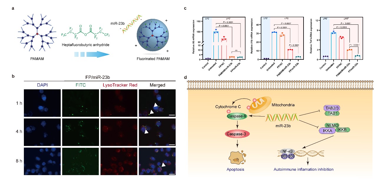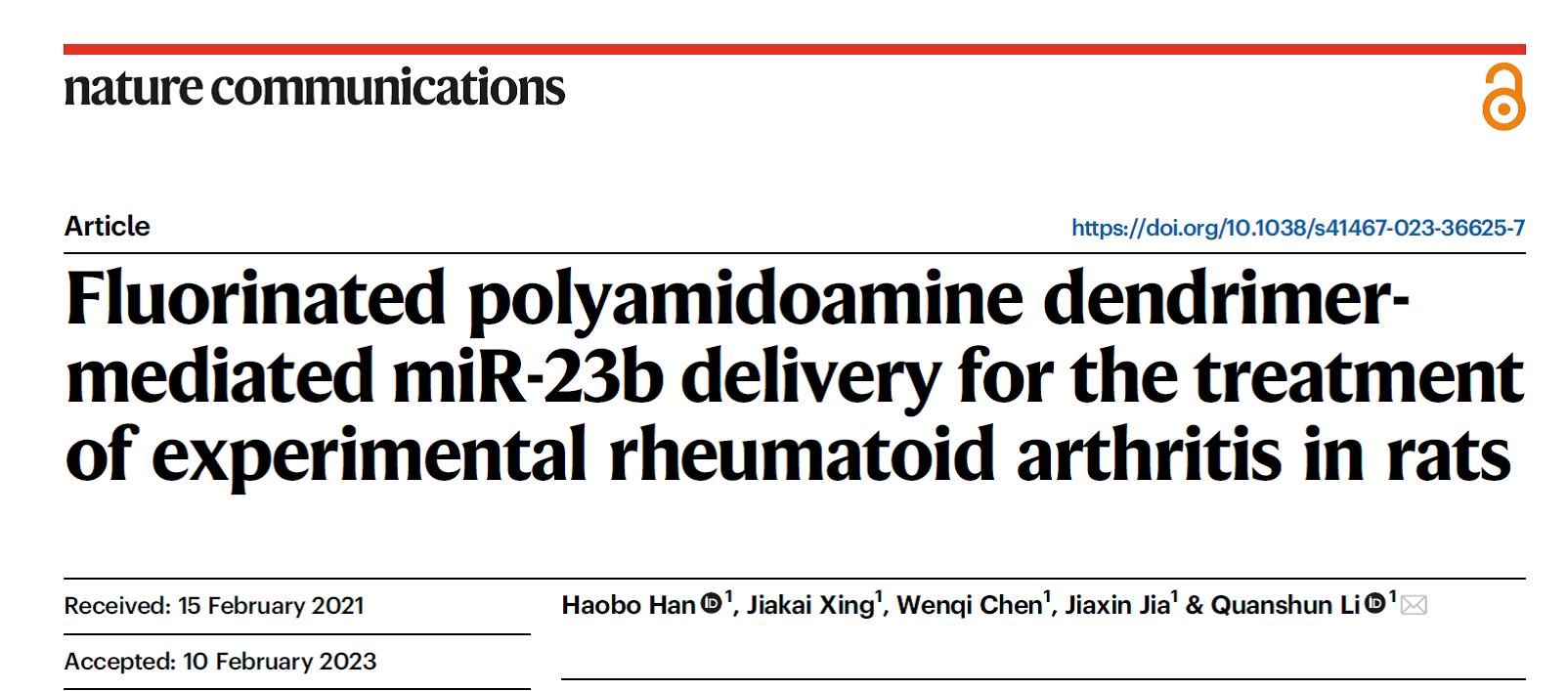 分子酶学工程教育部重点实验室李全顺教授团队,针对类风湿性关节炎的关键信号分子miR-23b,构建氟化修饰型树枝状高分子作为基因递送载体,实现miR-23b在关节炎动物模型中的稳定递送,取得了良好的治疗效果;同时,研究揭示了miR-23b能够抑制TAB2、TAB3以及IKK-α表达,阻断NF-κB炎症信号通路,并诱导巨噬细胞凋亡,实现体内抗炎功能。研究结果以Fluorinated polyamidoamine dendrimer-mediated miR-23b delivery for the treatment of experimental rheumatoid arthritis in rats为题,于2023年2月20日在学术期刊《Nature Communications》正式发表。论文第一完成单位为司机社