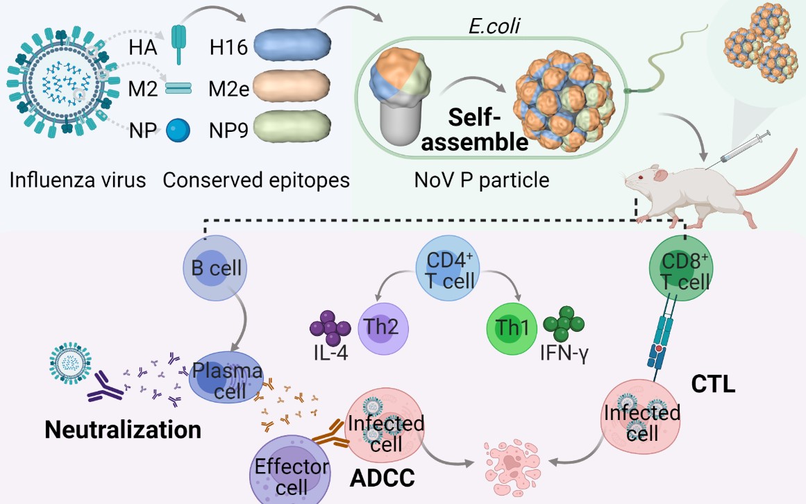 由于流感病毒的抗原漂移和抗原转变,目前的季节性流感疫苗只提供了有限的病毒株覆盖范围。精准靶向保守的结构功能域的表位疫苗有望拓宽流感疫苗的保护范围,有可能在自然免疫过程中诱导对非显性或隐性表位的强烈免疫应答,制造工艺简单,成本低,适合大规模生产;然而,较差的免疫原性极大地阻碍了表位疫苗的应用。本研究选用可自组装的NoV P 颗粒作为疫苗载体,模拟病原体大小并同时稳定展示流感病毒HA、M2e、NP的多个表位(HMN-PP),有望提高表位疫苗的免疫原性。HMN-PP在大肠杆菌中以可溶性形式大量表达并自组装成直径近20 nm的近球形蛋白质纳米笼。动物实验表明HMN-PP多表位纳米疫苗诱导了长效的HA特异性中和抗体、M2e特异性ADCC应答、NP特异性CTL应答。除了由HA表位诱导的中和抗体外,由M2e诱导的ADCC效应可保护小鼠免受致命流感病毒的攻击。与NoV P颗粒缀合的多个表位不会相互干扰,并且由表位诱导的Th1或Th2免疫应答倾向性不会受NoV P颗粒的直接影响。本研究表明NoV P颗粒有潜力作为疫苗载体以诱导强效和持久的免疫应答,多表位疫苗与自组装NoV P颗粒的组合可能是流感疫苗、新冠疫苗等高变异病毒疫苗研发的有效策略。