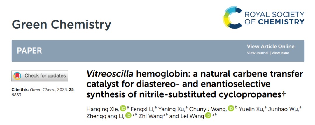 通过对血红蛋白结构和催化机制的进一步理解,课题组以血红蛋白具有的卡宾转移酶活力为基础,探索其在手性合成中的应用,结合分子对接技术多角度分析催化机制,以“Vitreoscilla hemoglobin: A natural carbene transfer catalyst for diastereo- and enantioselective synthesis of nitrile-substituted cyclopropanes”为题,在国际权威学术期刊《Green Chemistry》(影响因子9.8,中科院分区一区)在线发表研究论文。论文中报告了一种对环境友好的策略,将原位生成的重氮试剂与生物催化相结合,用于芳香烯烃的不对称环丙烷化。论文第一完成单位为司机社