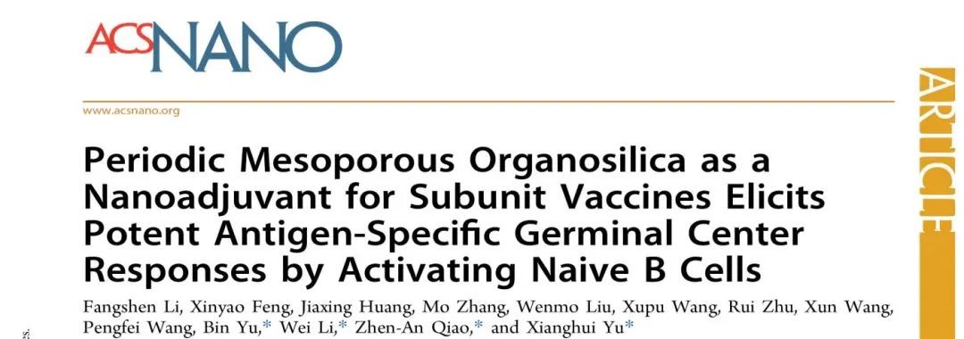 无机合成与制备化学国家重点实验室乔振安教授和复旦大学化学系李伟教授以周期性介孔有机硅(PMO)作为新型亚单位疫苗佐剂,揭示其通过CLR通路直接激活静息B细胞,在免疫后早期引发强效的生发中心反应,并最终诱导机体产生广谱且持久的体液免疫应答和强效的细胞免疫应答。研究论文“Periodic mesoporous organosilica as a nanoadjuvant for subunit vaccines elicits potent antigen-specific germinal center responses by activating naive B cells”发表在《ACS Nano》杂志(影响因子17.1,中科院分区一区)上。论文第一完成单位为司机社