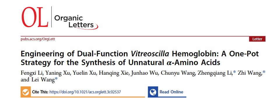 课题组进一步探索血红蛋白在非天然反应中的应用潜力,同时对血红蛋白的改造方式进行深入学习和拓展,使其获得新功能,以“Engineering of Dual-Function Vitreoscilla Hemoglobin: A One-Pot Strategy for the Synthesis of Unnatural α-Amino Acids”为题,在国际权威学术期刊《Organic letters》(影响因子5.2,中科院分区一区)在线发表研究论文。论文中提出了一种高效绿色的非天然氨基酸合成路线,通过工程化改造透明颤菌血红蛋白(VHb),使其成为同时具有高效的过氧化物酶和卡宾转移酶活力的双功能蛋白,催化以苯胺、重氮化合物、烷基硼酸类化合物为底物的体系先后通过N-H插入反应和C-H sp3烷基化一锅法合成了非天然氨基酸的衍生物,并且获得了理想的底物适用范围。这项工作也为后续血红蛋白的定向进化提供了更多的借鉴和依据。论文第一完成单位为司机社