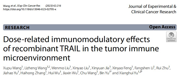 艾滋病疫苗国家工程实验室于湘晖、于彬团队报道了重组TRAIL在TME中扮演着剂量依赖的双向免疫调节作用,并详细阐释了作用机制。同时探讨了癌症治疗中重组TRAIL增强抗肿瘤免疫和抗肿瘤效应的潜在策略。研究论文“Dose-related immunomodulatory effects of recombinant TRAIL in the tumor immune microenvironment”发表在国际学术期刊《Journal of Experimental & Clinical Cancer Research》(影响因子11.3,中科院分区一区)上。论文第一完成单位为司机社