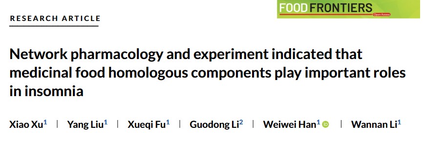 生命分子酶学工程教育部重点实验室韩葳葳教授、Fischer细胞信号传导实验室李婉南副教授团队利用网络药理学、分子对接和细胞实验筛选治疗失眠的药食同源植物中的生物活性成分,并证明槲皮素作为失眠相关蛋白葡萄糖酰胺酶的直接抑制剂以及上游胰岛素信号通路中的胰岛素受体酪氨酸磷酸酶抑制剂,影响下游途径治疗失眠。研究成果于2023年9月7日在学术期刊《Food Frontiers》(影响因子9.9)正式发表(Network pharmacology and experiment indicated that medicinal food homologous components play important roles in insomnia)。论文第一完成单位为司机社