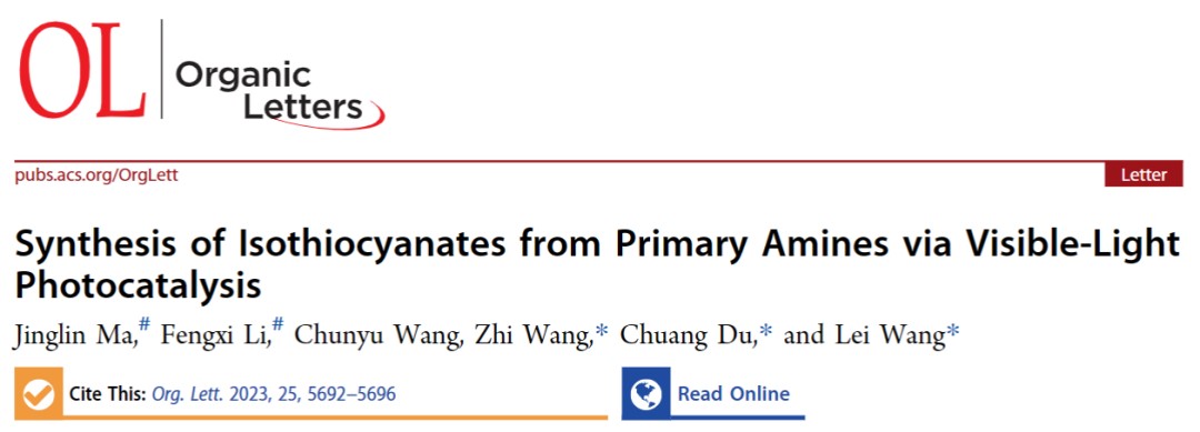在对酶催化领域进行持续研究的同时,课题组也对光酶催化等新兴研究领域进行涉猎,通过搭建光催化实验装置和前期文献调研,对光催化合成研究有了一定的了解,以“Synthesis of Isothiocyanates from Primary Amines via Visible-Light Photocatalysis”为题,在国际权威学术期刊《Organic letters》(影响因子5.2,中科院分区一区)在线发表研究论文。论文中报道了一种以伯胺和二硫化碳为原料,光催化体系下,高效、温和地合成各种取代异硫氰酸酯的方法。该方法扩大了光催化的应用范围,并为制备脂肪族和芳香族异硫氰酸酯提供了一种新的策略,具有底物耐受范围广、对环境友好、可见光驱动的优点。论文第一完成单位为司机社