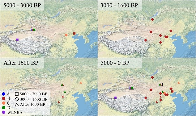 崔银秋教授团队针对近千例古代人类个体的宏基因组数据筛选开启了东欧亚大陆的古代HBV的进化研究,并最终在17个遗址年代从距今约 5000 -400 年的34个个体中检测到感染的HBV片段并获取了高质量的HBV基因组序列信息。研究结果表明,B型和D型基因可能起源于东亚;同时与欧亚大陆西部相比,在距今 5000 至 3000 年间欧亚大陆东部的 HBV 多样性水平更高,出现了五种不同的基因型(A、B、C、D、WENBA)共存的现象,这凸显了人类迁徙和互动在 HBV 传播中的重要性。研究还首次发现了存在从非重组亚基因型(B1、B5)向重组亚基因型(B2 - B4)过渡的可能。
