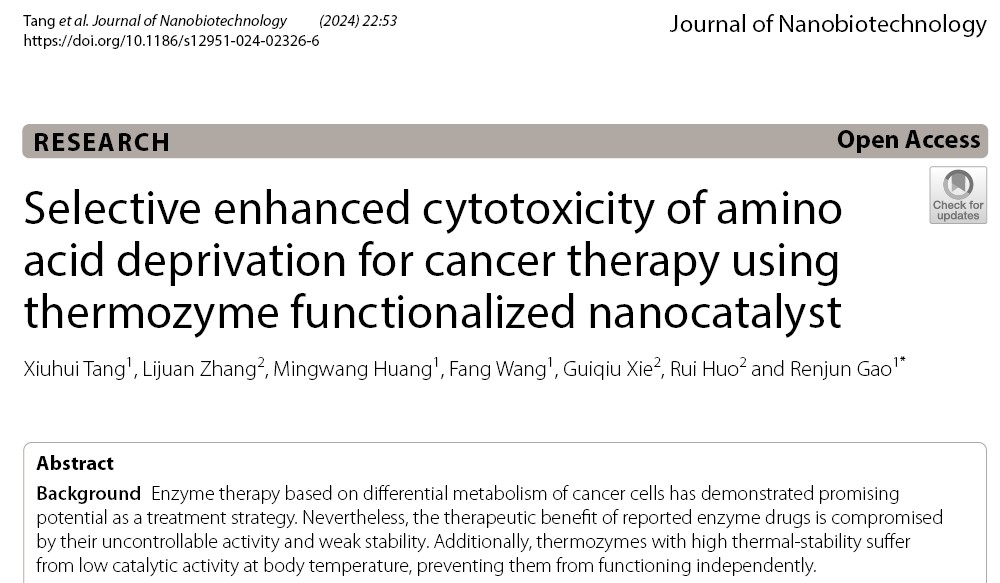 酶法治疗是很有潜力的癌症治疗策略,已报道的常温酶药物由于活性不可控、短半衰期等问题而使其治疗效果大打折扣。本课题组创造了一种新型的嗜热酶疗策略,用于乳腺癌的精准催化治疗:将嗜热精氨酸酶和天冬氨酸酶与纳米金和透明质酸偶联为纳米催化剂,靶向癌细胞后,用红外激光特异性激活嗜热酶消耗癌细胞内的氨基酸,诱发细胞凋亡,并协同光热治疗,有效杀伤了癌细胞。该疗法副作用小,范围可控,是一种有潜力的抗癌策略,相关结果发表在Journal of Nanobiotechnology,论文第一完成单位为司机社