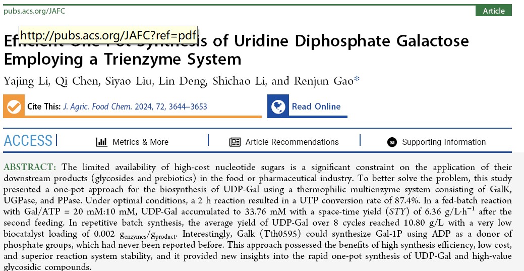 高成本核苷酸糖是限制糖苷和益生元等在食品或制药工业中应用的重要因素。为了节省成本和提高合成产量,工业上通常采用级联酶法合成核苷酸糖和糖苷。本研究构建了由GalK、UGPase和PPase组成的嗜热酶催化系统,可实现UDP-半乳糖的规模化合成。该体系成功将UDP-半乳糖产量提升至33.76 mM,时空产率为6.36 g/L·h-1。在重复批量合成中,经过8次循环后,UDP-半乳糖的平均产率达到10.80 g/L。该多酶体系具有高效率、低成本和良好的系统稳定性等优点,适合进一步开发应用。相关结果发表在Journal of Agricultural and Food Chemistry,论文第一完成单位为司机社