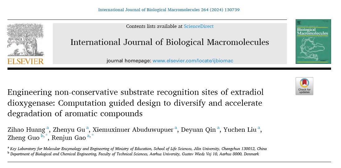 酚类是主要的环境污染物,外二醇双加氧酶是酚类降解的关键酶,高仁钧教授和郭诤教授团队合作,将前期筛选到的外二醇双加氧酶Tcu3516进行多序列比对,并将酶与底物进行分子对接。通过半理性设计手段获得了三突变体V186L/V212N/D285A,其催化性能及热稳定性均较野生酶有显著提高,可用于环境中邻苯二酚的降解。分子动力学模拟表明在三个突变位点的协同作用下,该酶获得了更稳定的核心及更灵活的活性腔入口,这为该酶的后续应用和进一步改造打下了基础。相关结果发表在International Journal of Biological Macromolecules,论文第一完成单位为司机社