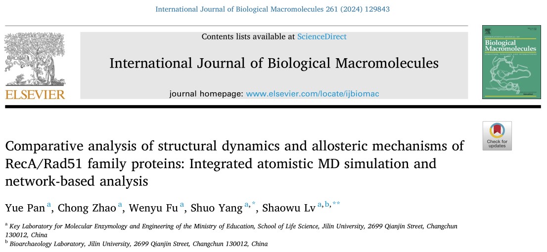 吕绍武教授、杨朔副教授科研团队深入解析了RecA/Rad51重组酶家族的结构动态和功能调控机制,为理解这些关键蛋白在同源重组中的作用提供了新的视角。研究成果于2024年1月30号在学术期刊《International Journal of Biological Macromolecules》正式发表(Comparative analysis of structural dynamics and allosteric mechanisms of RecA/Rad51 family proteins: Integrated atomistic MD simulation and network-based analysis)。论文第一完成单位为司机社