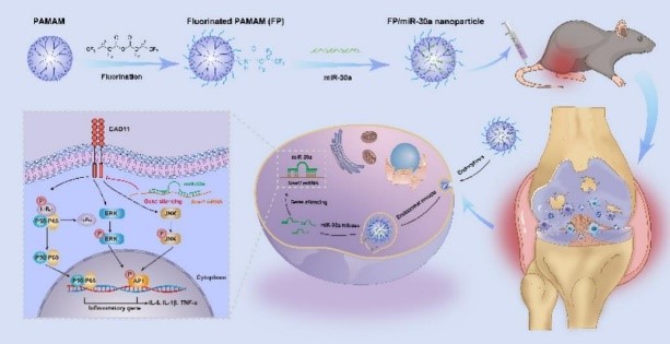 分子酶学工程教育部重点实验室李全顺/韩浩博团队,在基于miR-23b递送抗类风湿性关节炎研究的基础上(Nat. Commun. 2023, 14: 944),挖掘了一类与炎症发生发展密切相关的miRNA—miR-30a,其通过靶向Snai1基因进而调节Cad11表达,抑制NF-κB和MAPK信号通路,实现类风湿性关节炎的精准治疗;以氟化聚酰胺-胺树枝状聚合物为载体,实现了miR-30a的体内稳定递送,动物水平取得了良好的抗炎效果,为类风湿性关节炎及其他自身免疫性疾病的基因治疗研究提供了新的思路。相关研究“Fluorinated dendrimer-mediated miR-30a delivery regulates the inflammation of macrophages and mitigates the symptoms of rheumatoid arthritis”发表于国际学术期刊Journal of Controlled Release(1区,影响因子10.5)。论文第一完成单位为司机社
