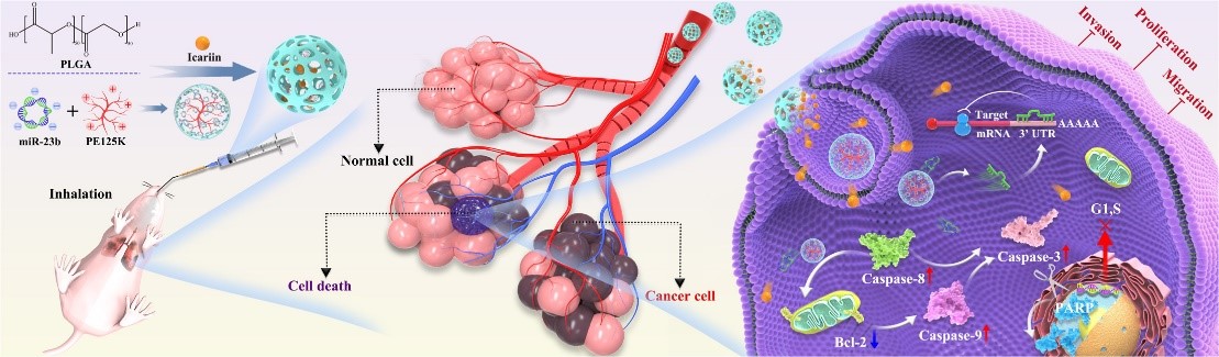 同时,miR-23b除具有抗炎功能外,其能够抑制细胞增殖,在肿瘤基因治疗研究中具有广阔的前景。研究团队针对肺癌传统治疗手段靶向性差及副作用大等缺陷,构建了以PLGA为基质的多孔微球体系,该体系实现了淫羊藿苷与miR-23b的担载,基于吸入式策略实现了药物与治疗基因在肺部的靶向沉积和持续释放,有效诱导肺癌细胞凋亡并抑制肿瘤转移,为肺癌的药物与基因联合治疗提供了一条局部给药新策略。相关研究“Porous PLGA microspheres for the inhalation delivery of icariin and miR-23b in the treatment of metastatic lung cancer”发表于国际学术期刊Asian Journal of Pharmaceutical Sciences(1区,影响因子10.7)。论文第一完成单位为司机社