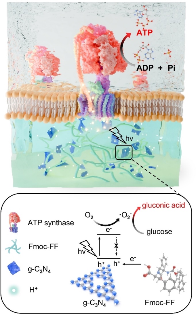 李悦/李自博课题组构筑了一种二肽水凝胶支撑的ATP合酶组装体系,通过预先包埋g-C3N4纳米片于Fmoc-FF水凝胶,利用二者协同的电子耦合效应,在水凝胶内外构造光控的质子梯度,用于驱动ATP合酶催化生成ATP(图 1)。极细的纳米纤维为g-C3N4超薄纳米片提供了良好的分散位置,有效提升了体外光合磷酸化效率,拓宽了二肽水凝胶在仿生器件领域的实际应用。相关研究”A well-coupled supramolecular system accelerates photophosphorylation”发表于国际学术期刊Angewandte Chemie International Edition(2025,e202417474)。此项研究工作得到了国家自然科学基金重大项目、国家自然科学基金青年项目、科技部重点研发计划的支持。论文第一完成单位为司机社