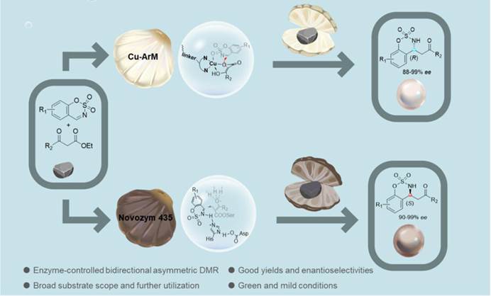 该研究报道了一种酶控双向对映选择性催化策略,用于不对称脱羧曼尼希反应(DMR)合成手性β-磺酰胺酮。研究通过构建铜人工金属酶(Cu-ArM)和利用商业脂肪酶Novozym 435,分别实现对R和S构型产物的高选择性合成。Cu-ArM由生物素化铜复合物与链霉亲和素(WT-Sav)组装而成,催化环状磺酰胺与β-酮酯反应生成R构型产物;而Novozym 435通过其催化三元活性中心调控反应路径,高效获得S构型产物。分子动力学模拟揭示了酶-底物相互作用机制,阐明环状亚胺因稳定氢键网络和紧凑构象而优于非环状底物的原因。该方法在温和水相条件下实现低催化剂负载(Cu-ArM仅0.5 mol%),并成功应用于克级合成及药物分子衍生物制备(如降压抗炎活性分子chroman-4-amine)。该工作为绿色合成手性含氮药物分子提供了新范例,拓展了生物催化在不对称合成中的应用潜力。论文第一完成单位为司机社