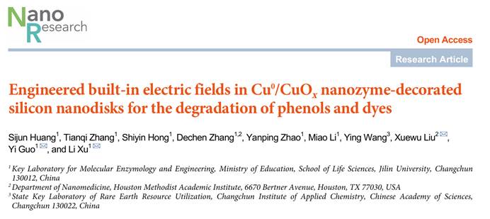 此外,徐力、郭轶教授团队以多孔硅盘(DPS)作为载体,通过化学还原负载Cu纳米粒子,成功合成了一种具有类漆酶活性的Cu@DPS纳米酶。与天然漆酶相比,Cu@DPS纳米酶表现出更好的底物亲和力和更高的稳定性,可用于酚类污染物和染料的催化降解。DFT计算表明,Cu@DPS中异质界面形成的内键电场在维持纳米酶表面Cu的价态和氧空位的数量方面起着关键作用,从而保证了Cu@DPS纳米酶的持续催化性能。该研究表明,纳米酶的类酶活性不仅仅受到表面状态影响,在特定情况下其内部结构同样能够影响其催化性能,这可以为高效纳米酶的设计提供了新的思路和方法。研究论文“Engineered built-in electric fields in Cu0/CuOx nanozyme-decorated silicon nanodisks for the degradation of phenols and dyes”发表在国际学术期刊《Nano Research》上。论文第一完成单位为司机社