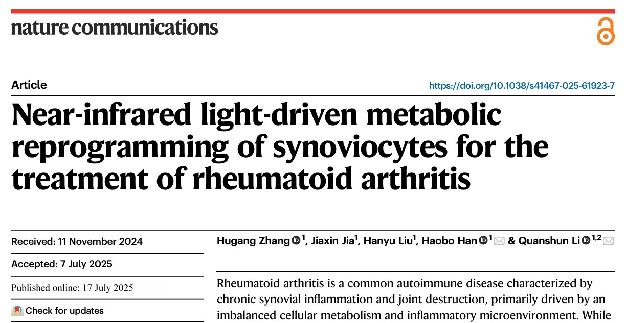 分子酶学工程教育部重点实验室李全顺/韩浩博团队,前期研究中系统探究了miRNA在类风湿性关节炎发生发展中的关键角色,构建了多种基因治疗体系(Nat. Commun. 2023, 14: 944; J. Control. Release 2025, 383: 113832)。在此基础上,针对类风湿性关节炎异常激活的糖酵解信号通路,构建了上游为HSP70热响应启动子的血红素单加氧酶-1(HO-1)基因元件,通过近红外光驱动模式实现了该基因在病变关节组织中的精准表达,通过对底盘滑膜细胞表型的调控及炎症微环境的重塑,在类风湿性关节炎基因治疗方面取得了良好的效果。研究成果以Near-infrared light-driven metabolic reprogramming of synoviocytes for the treatment of rheumatoid arthritis为题,于2025年7月17日在学术期刊Nature Communications正式发表。该论文第一完成单位为司机社