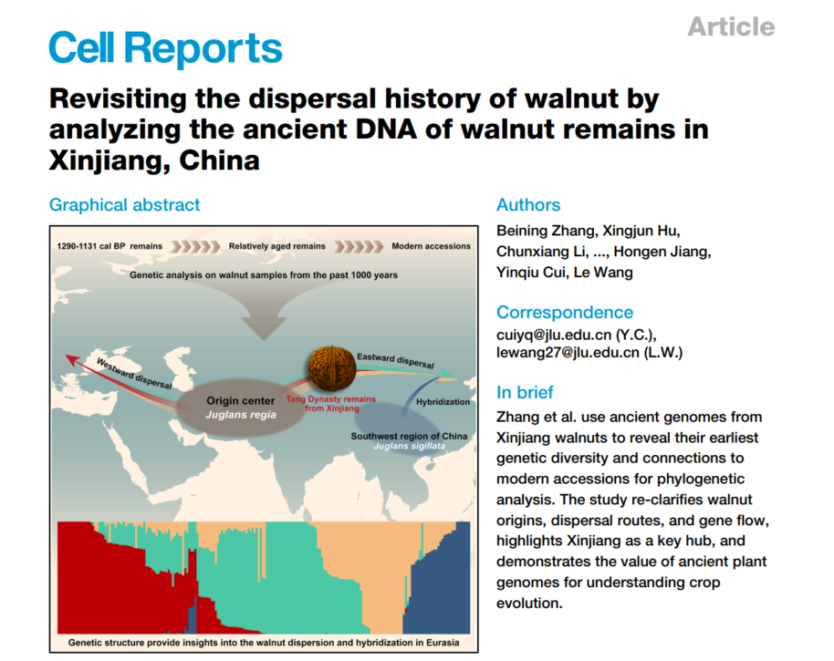 崔银秋教授与植物科学学院王乐副教授团队利用古DNA技术成功获取了世界首例古代核桃全基因组数据,并综合运用古基因组学与群体遗传学分析手段系统揭示了核桃(Juglans regia)在丝绸之路上的传播路径及遗传演化特征。该研究不仅填补了核桃古基因组数据的空白,更为揭示丝绸之路上关键经济作物的传播历史与驯化轨迹提供了直接的分子证据。该研究成果以“Revisiting the dispersal history of walnut by analyzing the ancient DNA of walnut remains in Xinjiang,China”为题,在国际权威学术期刊《Cell Reports》上发表。司机社