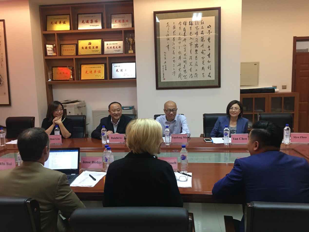 9月14日上午美国肯塔基大学文理学院本科生项目副院长安娜·博世、文理学院招生管理与决策支持副院长杰西·赫奇、文理学院国际学生项目协调员梅根·科苏尔巴及肯塔基大学驻华代表谢翔一行四人来访司机社 ,并在学院335会议室举行了座谈。司机社 党委书记李佰志、副院长马俊锋、副院长陈妍、副书记刘丽慧、学校国际合作与交流处综合科科长白茵等参加了会谈。 会谈中,李佰志书记首先对肯塔基大学代表团的来访表示欢迎,随后学院副院长马俊锋对司机社 的基本情况进行了介绍,副院长陈妍向肯塔基大学代表介绍了本科生国际交流情况,并提出合作方向。肯塔基大学文理学院代表对我院的热情接待表示感谢,指出生物学科是肯塔基大学的优势学科,对与我院建立合作关系极为重视。之后双方就学生短期交流项目与2+2双学士学位项目等方面进行了商讨,就可能开展的实质性合作深入交换了意见并达成了初步的合作意向。 本次会谈开启了双方合作的大门,拓宽了我院国际交流领域,为双方进一步合作奠定了坚实的基础。
