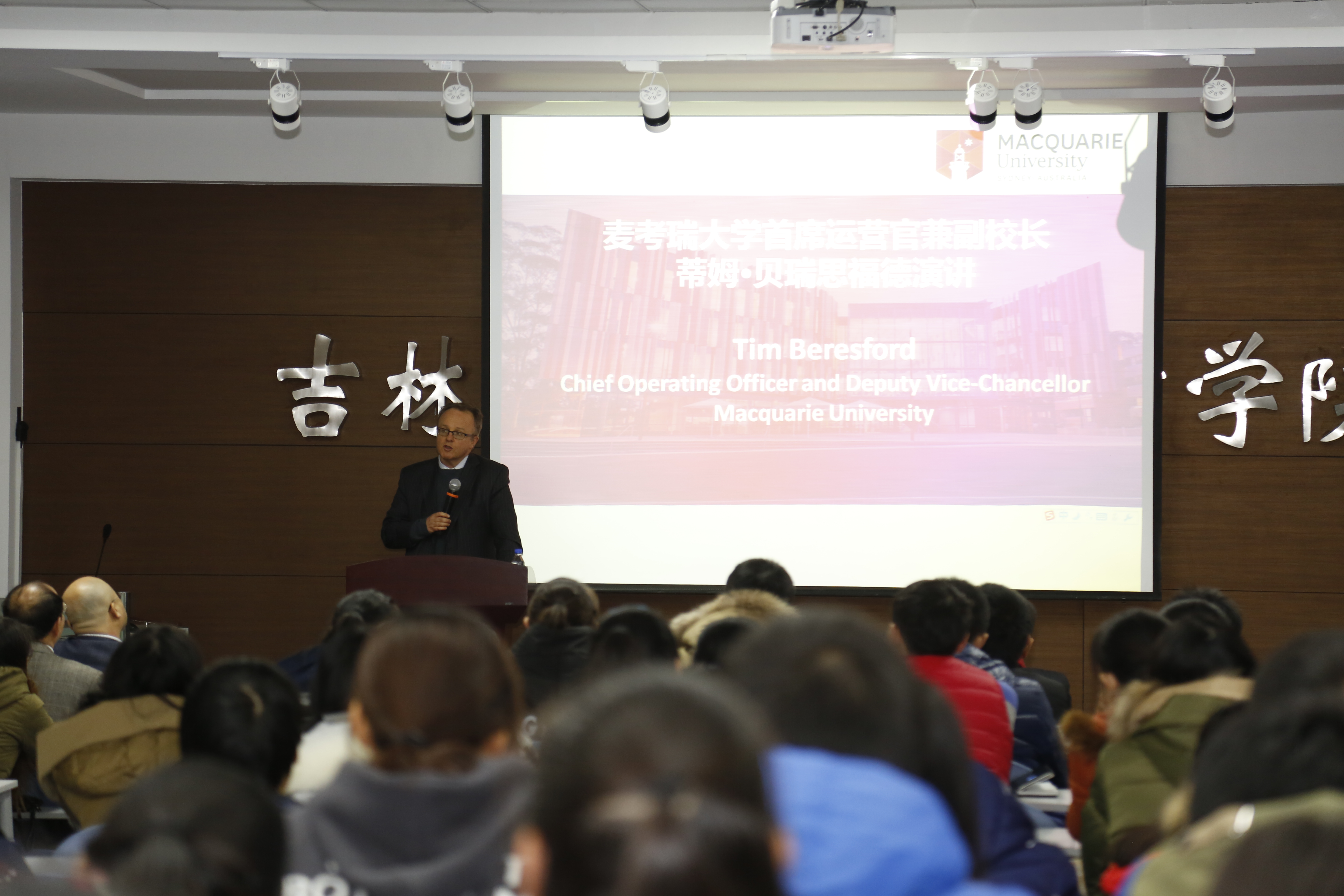 报告厅做了精彩的报告。蒂姆·贝瑞斯福德是麦考瑞大学首席运营官兼副校长,负责全面监管学校工作,包括国际学生的招生、财务管理、人力资源等。学校国际合作与交流处副处长部铁军、司机社