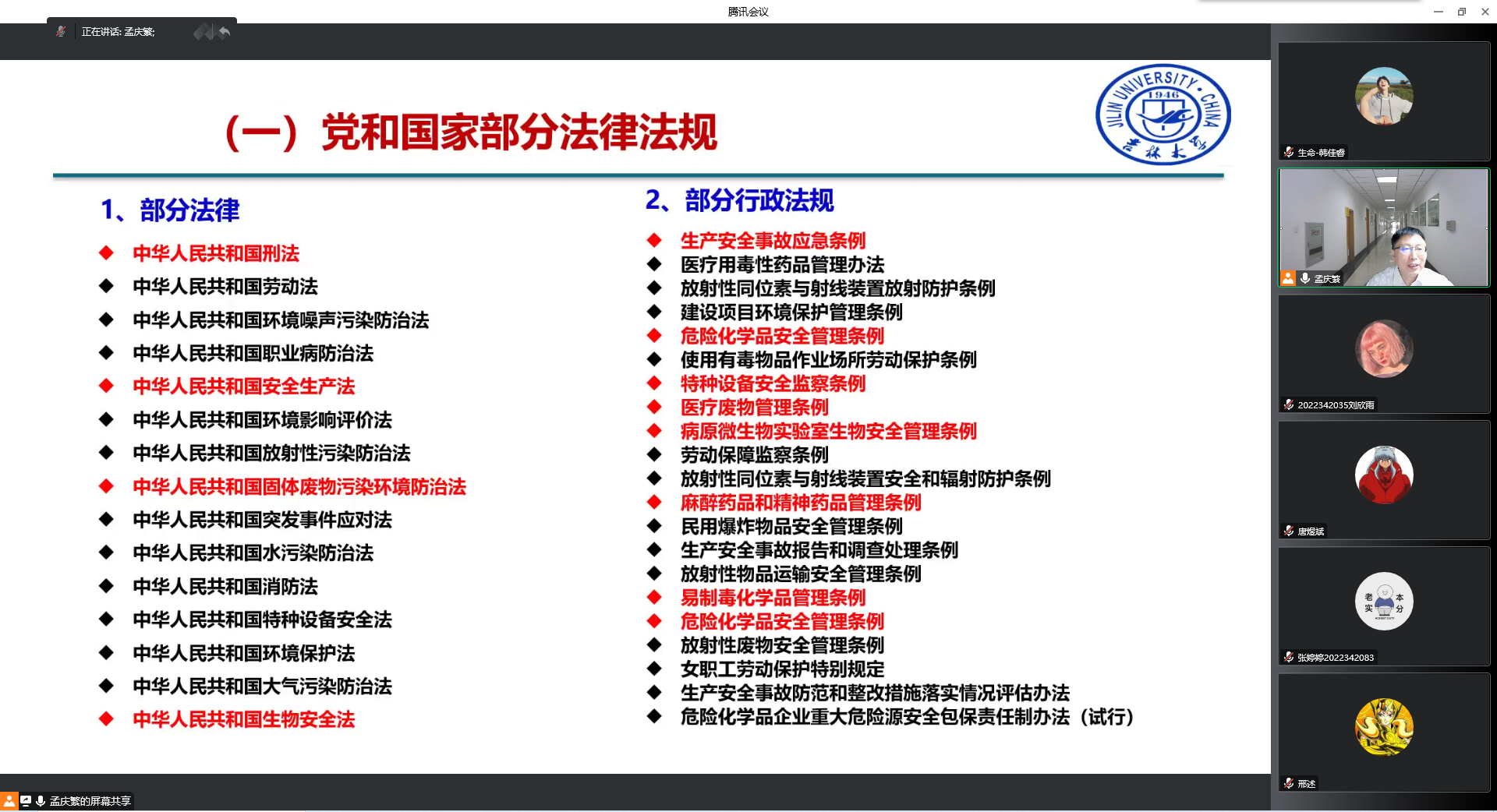 国家级生物实验教学示范中心副主任孟庆繁以《新时期实验室安全面临的主要问题与应对策略》为主题为学院研究生做专题授课,结合高校实验室生物安全的实际情况,从生物安全立法背景、生物安全法相关内容、实验室生物安全风险防控措施等方面,通过具体案例提醒同学们注意实验室安全,以及实验室安全的重要性,通过多角度、多方式的讲解,增强学生对实验室安全知识的记忆,为同学们上了一堂别出心裁的安全教育课。邢述在课程总结中表示,实验室安全无小事,实验室的安全关系到学生的生命安全,实验室的安全对学校和社会的稳定起着举足轻重的作用。