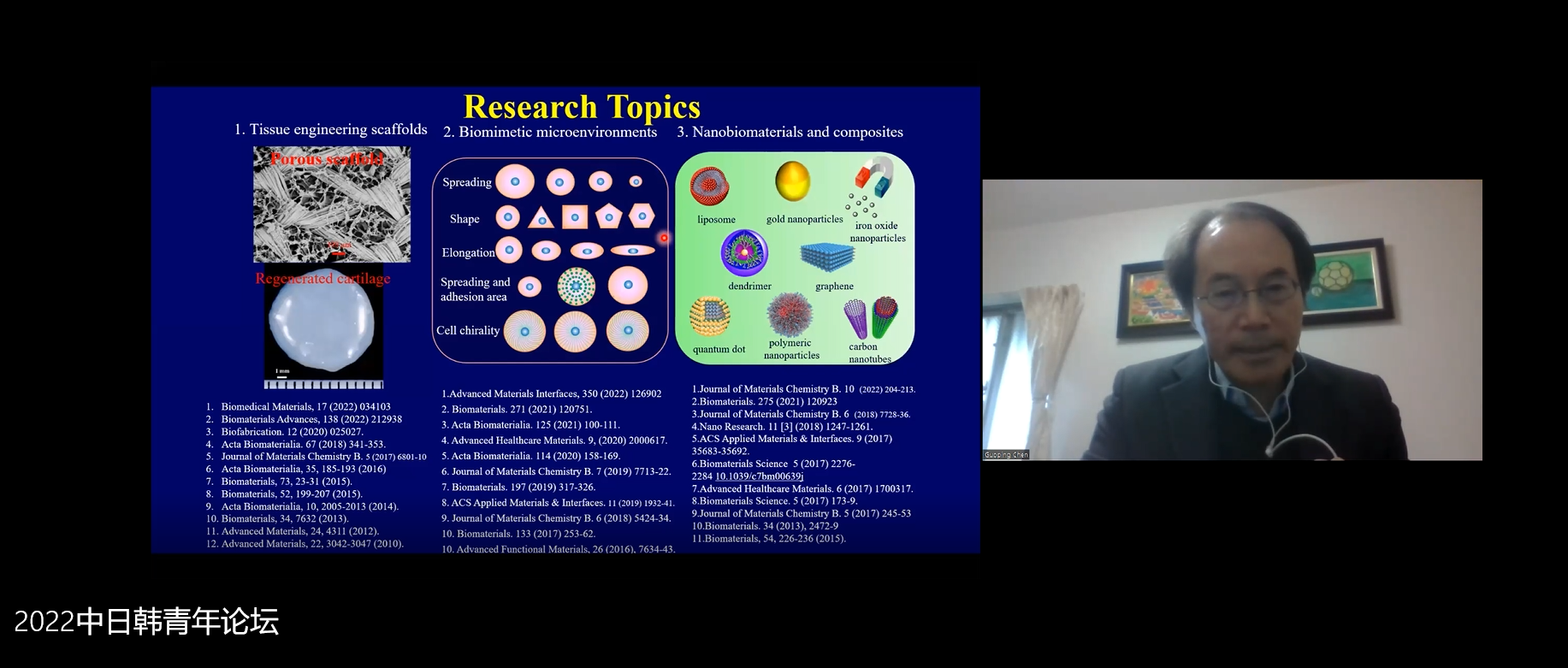 论坛围绕“生物医药与健康”和“生物医学工程和生物技术”议题,由来自韩国汉阳大学的Hyungshin Yim教授、Jae-Yeol Joo副教授、延世大学Na-Young Song 助理教授、韩国建国大学Jinhong Wie 助理教授、日本筑波大学陈国平教授、大阪大学吕玉泉副教授、日本横滨市立大学Yongchan Lee助理教授、日本兵库医科大学Hirosato Kanda助理教授、段韶琪博士后、德国马克斯普朗克生物物理研究所吴迪博士后、司机社