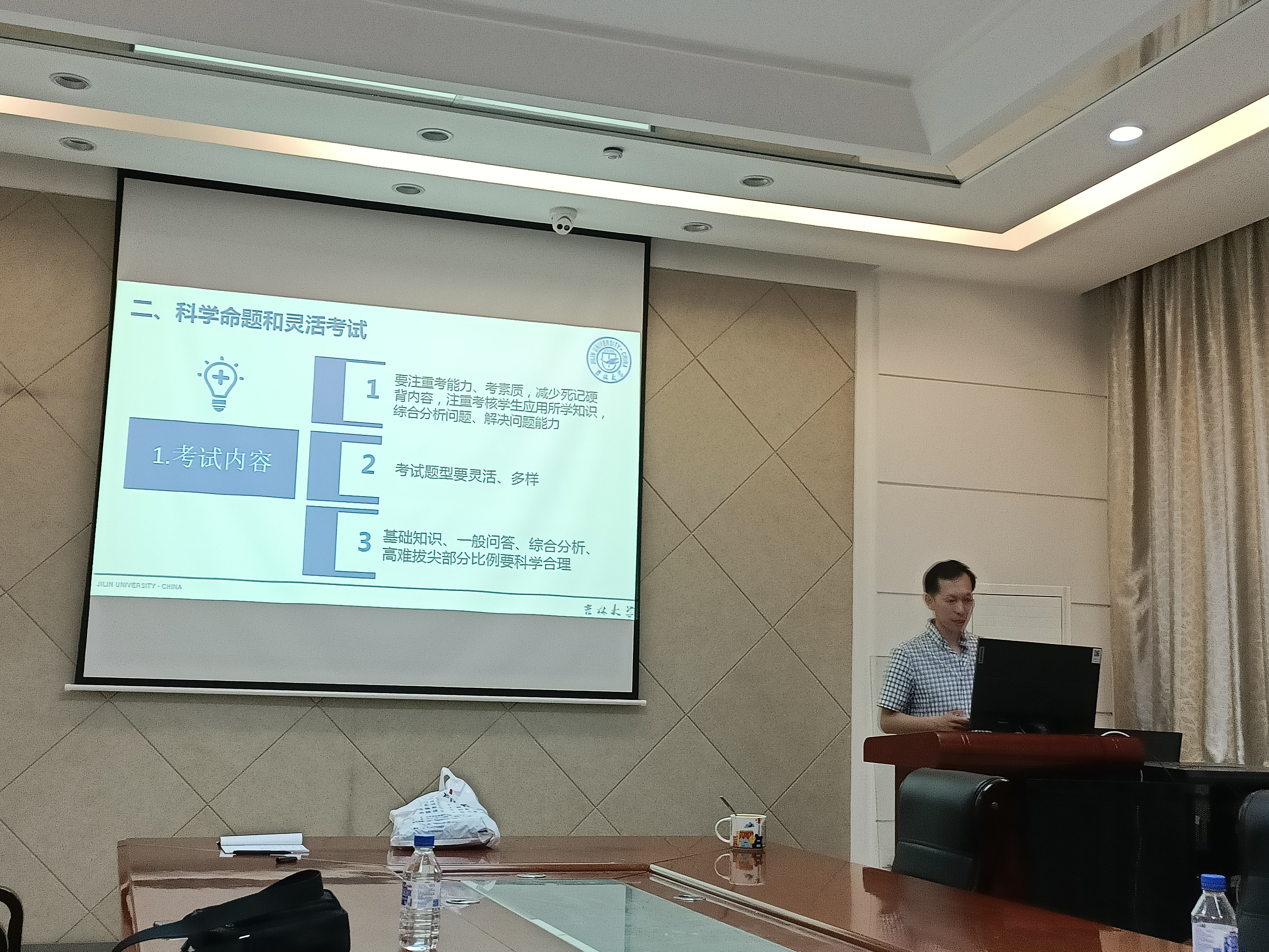 本科课程考核管理办法》(校教字﹝2020﹞123号)为指导,从考前工作布置及教育动员、科学命题和灵活考试、考务组织安排、考风考纪、阅卷工作等五个环节,对考试相关工作做了详细、具体的讲解,并对考试题型、试题内容及考核方式、考试改革的要求和建议做了全面地阐述。按照学校要求,对监考、巡考的工作提出明确要求,在本次期末考试中要遵循“预防在先,惩戒在后”的原则,做到严肃考纪、端正考风,严禁出现违纪、作弊行为;要求阅卷工作公平、公正且及时,从而确保考试平稳、诚信、公平地进行。校级教学督导专家杨德胜以优秀试卷评阅案例为基,充分详实地讲解了试卷设计、题型结构、评阅规则、赋分要求、试卷复核、成绩分布与登录以及试卷分析填写等方面的内容,重点强调了历年来学校组织试卷复查中发现的典型问题,提倡阅卷科学规范,成绩公平公正。学生工作办公室主任张春阳重点强调了学院对学生关于加强考风考纪的具体要求,并明确了考场违纪处理的规则、方式以及注意事项。