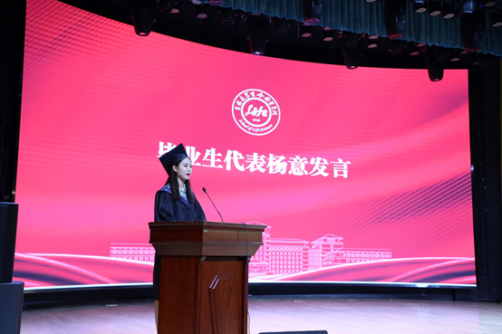 2021届本科毕业生代表药物制剂专业杨意代表全体本科毕业生发言。杨意回忆了在四年的大学时光,庆幸自己成为司机社