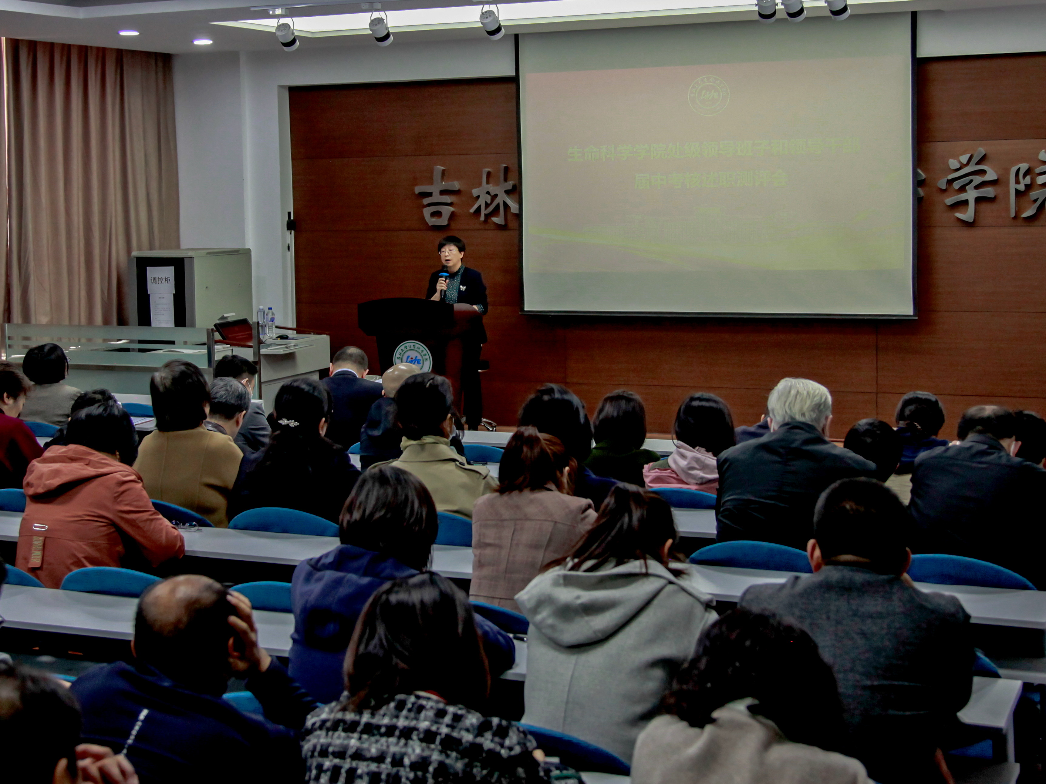 于生命科学楼107报告厅召开处级领导班子和领导干部届中考核述职测评会。会议由党委书记白宇主持。