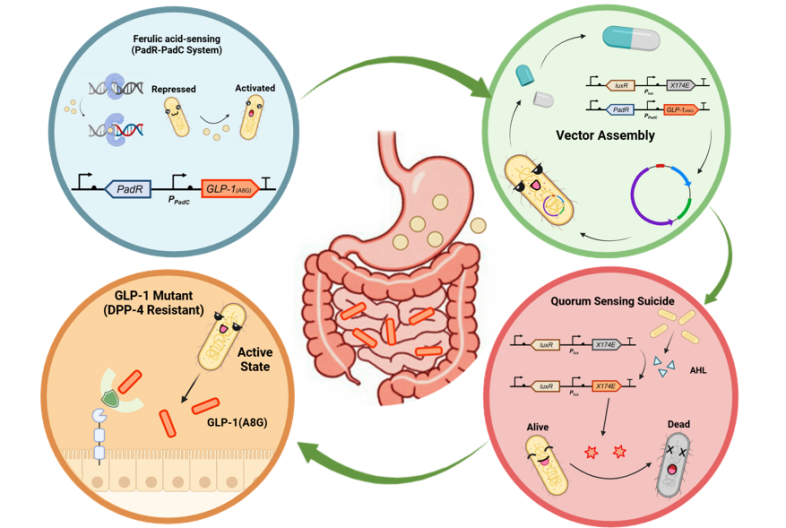 此次 Jilin-China 团队提出的“饮食响应型智能治疗系统”项目以糖尿病与肥胖等代谢性疾病为切入点,基于益生菌 E. coli Nissle 1917 构建了可响应健康饮食信号的智能治疗平台。系统利用全谷物中天然化合物阿魏酸(ferulic acid)作为信号触发,驱动细胞分泌改良型GLP-1激素,实现餐后自动调节血糖。