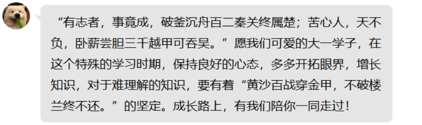 虽然同学们的感想只有寥寥数语,但却示意昭昭。相信本期的学习经验交流会让大家受益匪浅,希望19级的同学们在期末考试复习时能够更加高效自信,取得好成绩,不辜负学长学姐们的热情分享。