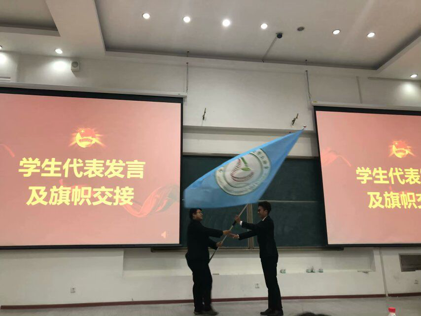 团学联组织学生干部名单。接着,崔帅老师、马莹老师、丁子芮老师分别为新一届团学联组织的主要学生干部颁发聘书,并合影留念。在同学们热烈的掌声中,学生代表进行团学组织旗帜交接仪式,并发表演讲。随后,2018届社团联合会主席宣布司机社