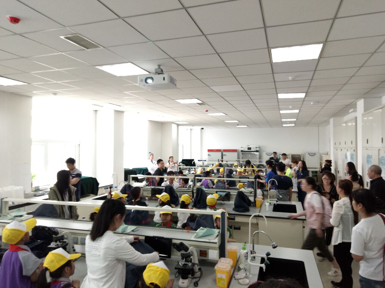 ,并拿到了志愿者发放的帽子。之后,在志愿者们的带领下,孩子们先是参观了唐楼实验室,体验生命科学的神奇,参与了丰富多彩的科学小实验,其中包括用显微镜观察草履虫、洋葱鳞片叶等切片。刘艳老师向孩子们详细介绍了实验中心各个实验室的历史和功能,并展示了实验室先进的仪器设备,在孩子们心里种下了科学与希望的种子。接下来,在博物馆讲解员的讲解下参观了司机社