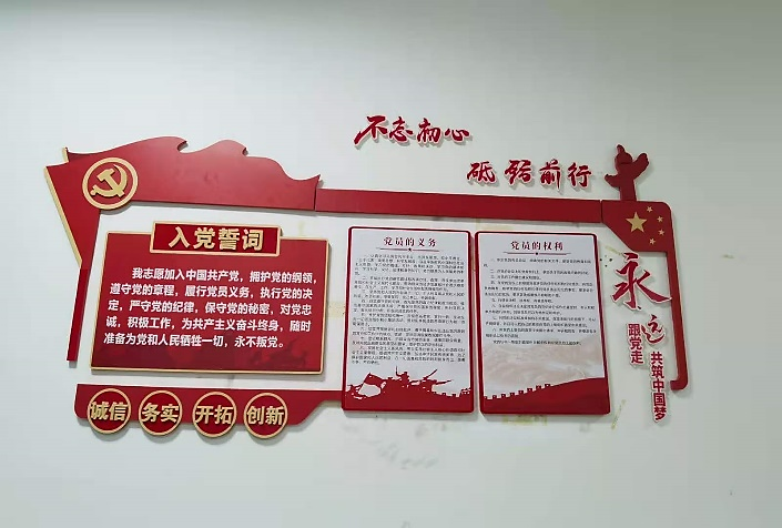 “党员学习园地”主要包括展示墙和学习角两个部分,展示墙部分主要呈现了入党誓词、党员义务和权利内容,学习角部分有《习近平谈治国理政》第一二、三卷、《新时代、新思想、新征程》、《习近平新时代中国特色社会主义思想学习纲要》、《爱之深 爱之切》、《中国共产党九十》、《习近平总书记系列重要讲话读本》等学习书籍和资料,供大家借阅和交流。