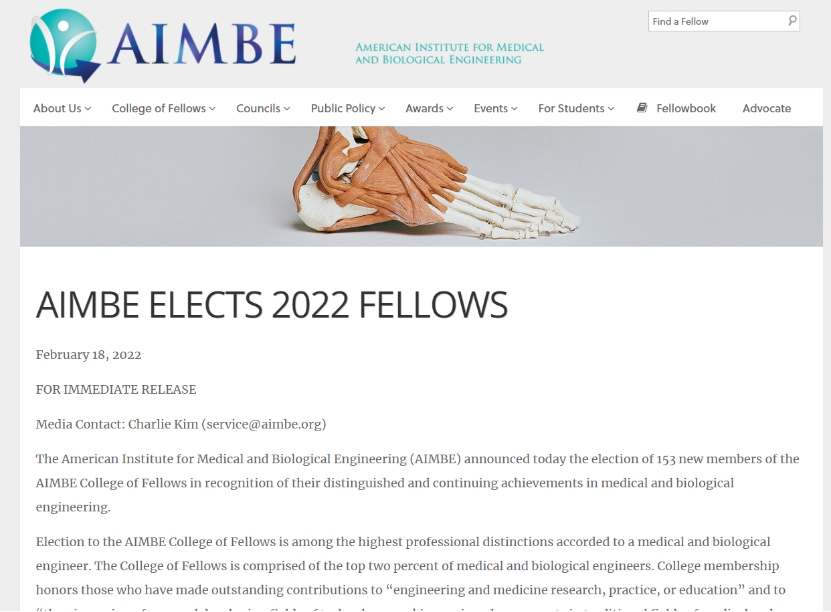 美国医学与生物工程院(American Institute for Medical and Biological Engineering,简称AIMBE)隶属于美国科学院,是国际医学与生物工程领域著名的非营利性学术组织,汇聚了世界生物医学工程领域的学术精英(Top 2%),以及最具创新和特色的医学与生物工程领域的学者和工程师,其中包括3名诺贝尔奖得主、18位美国总统奖得主、201位美国工程院院士、101位美国医学院院士及45位美国科学院院士。AIMBE Fellows由世界医学与生物工程领域最杰出的学者组成,每年经过国际同行推荐与严格评选产生,由现有Fellows推荐,经两轮筛选,最后一轮须经过现有的全体Fellows投票,是美国医学和生物工程技术领域的最高学术荣誉。