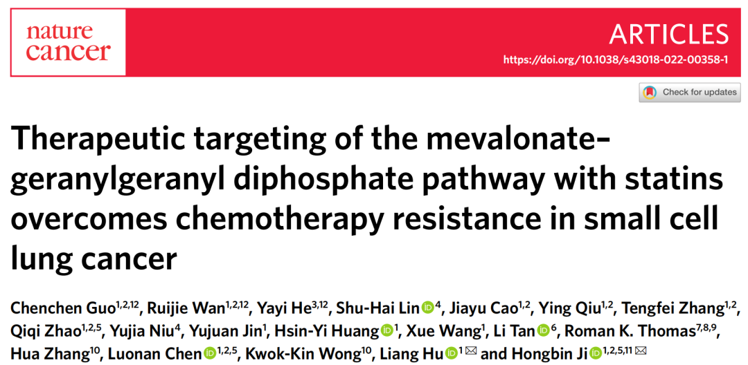 校友、中国科学院分子细胞科学卓越创新中心(生物化学与细胞生物学研究所)季红斌及其课题组在Nature Cancer上发表了文章 Therapeutic targeting of the mevalonate–geranylgeranyl diphosphate pathway with statins overcomes chemotherapy resistance in small cell lung cancer。该研究揭示了甲羟戊酸(MVA)- 香叶基香叶基二磷酸(GGPP)代谢途径在小细胞肺癌化疗耐药中的功能及其机制并提出靶向治疗新策略。