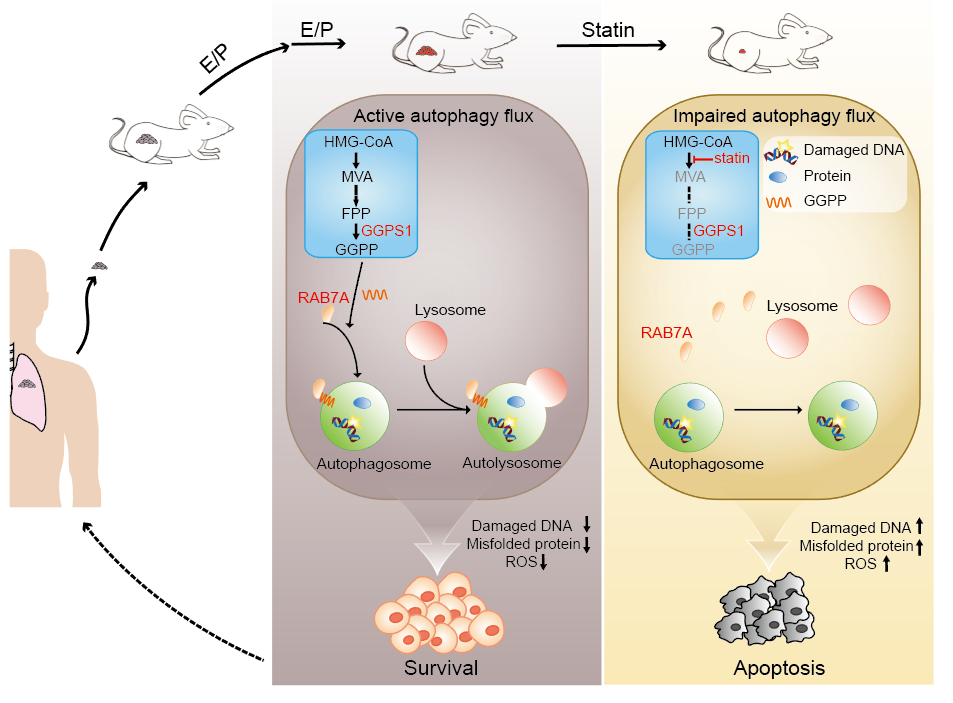 该研究通过建立小细胞肺癌患者样本来源的异种移植瘤(PDX)和人小细胞肺癌细胞系来源的移植瘤小鼠模型,模拟临床给药方案对这些小鼠模型进行了长达一年半的化疗药物处理,最终建成了多个小细胞肺癌化疗耐药的小鼠模型。在此基础上,研究人员专门利用一个含有1971个美国FDA认证的药物库来筛选能够特异性抑制化疗耐药细胞存活的潜在药物。有意思的是,他们发现抑制甲羟戊酸代谢途径的他汀类药物能够显著地抑制化疗耐药细胞的存活。利用另外一个含256个美国FDA认证的代谢类药物库进行筛选验证,他们同样发现多种他汀类药物可以特异性抑制化疗耐药细胞的存活。进一步的机制研究发现,他汀类药物主要是通过抑制甲羟戊酸代谢途径中香叶基香叶基二磷酸的生成,阻滞小G蛋白RAB7A的香叶基香叶基化修饰过程,抑制自噬体与溶酶体的融合,引发自噬流障碍,促使耐药细胞中ROS过度累积而发生细胞凋亡。