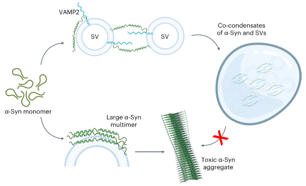 图2. VAMP2调节α-Syn相分离和功能的分子机制示意图