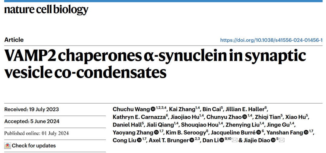 校友、上海交通大学Bio-X研究院李丹课题组与美国辛辛那提医学院刁佳杰课题组在Nature Cell Biology上在线发表题为VAMP2 chaperones α-synuclein in synaptic vesicle co-condensates的研究成果,首次报道了α-syn、VAMP2和SV在体外和神经元中的共相分离现象。