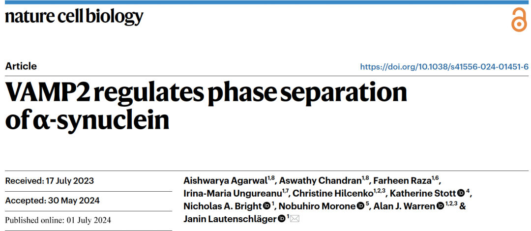 值得一提的是,英国剑桥大学的Janin Lautenschläger课题组同期独立发现了与本研究类似的VAMP2调节α-syn相分离的现象【9】,两个独立工作相互验证支持,并以背靠背的形式同一天在线发表于Nature Cell Biology上(图3)。