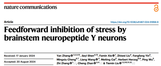 校友、复旦大学刘铁民教授团队在Nature Communications上发表了名为Feedforward inhibition of stress by brainstem neuropeptide Y neurons的文章。文章发现脑干中缝背核/腹外侧导水管周围灰质(Dorsal raphe nucleus/ ventrolateral periaqueductal gray, DRN/vlPAG)NPY神经元(NPYDRN/vlPAG)可响应各种压力刺激,抵抗压力应激引起的进食量减少和焦虑状态,为压力相关的厌食/体重降低以及焦虑等情绪症状的治疗提供新思路。
